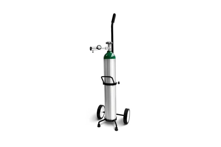Cilindro portátil usado no tratamento de doenças respiratórias, fornecendo até 80% de ar puro para auxiliar na oxigenação e no bem-estar respiratório.